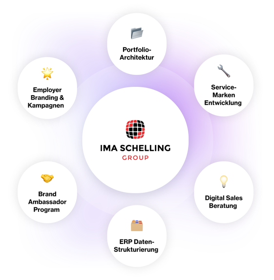 Seit der Fusion im Jahr 2015 hat sich die IMA Schelling Group mit einer Vielzahl strategischer und inhaltlicher Fragestellungen auseinandergesetzt. Gemeinsam mit der Unternehmensleitung auf C-Level und der Marketing-Leitung haben wir zentrale Themenschwerpunkte bearbeitet – stets mit dem Ziel, die Marke nach innen und außen zu stärken, das Unternehmen durch innovative Produkte zukunftsorientiert auszurichten und die Architektur der Produkt- und Servicemarken klarer zu definieren. Seit 2019 stehen wir der IMA Schelling Group als agnostischer und ganzheitlich denkender Partner beratend zur Seite.