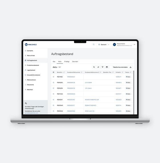 Ergänzend bietet das Portal eine zentrale Übersicht zu servicebezogenen Vorgängen – inklusive Statusinformationen zu bereits eingereichten Anliegen. Die Darstellung orientiert sich an den internen Prozessschritten von WAELZHOLZ und schafft damit volle Transparenz über den Bearbeitungsstand. Durch die gebündelte Verfügbarkeit aller relevanten Informationen wird das Portal zunehmend zum Single Point of Truth für Kunden – nicht nur zur Einsicht, sondern auch als zentrale Ablage. Ein separates Archiv ist damit oft nicht mehr notwendig.